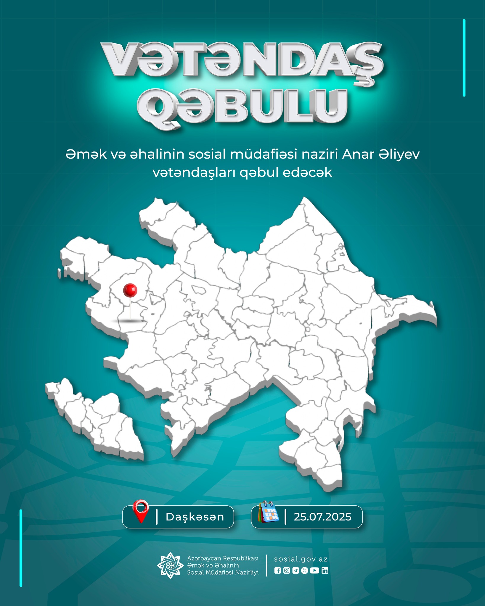 Əmək və əhalinin sosial müdafiəsi naziri Anar Əliyev iyulun 25-də Daşkəsən rayonunda Daşkəsən və Göygöl rayonlarının sakinlərini qəbul edəcək.