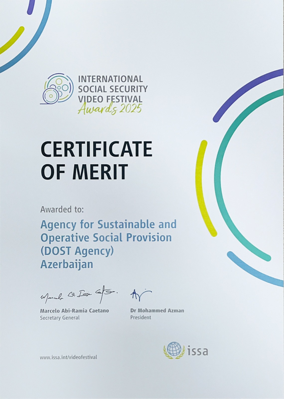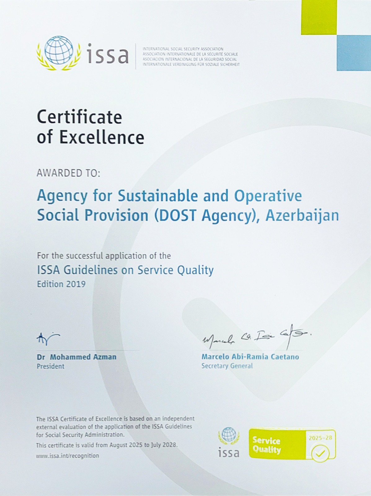 Əmək və Əhalinin Sosial Müdafiəsi Nazirliyinin tabeliyindəki Dayanıqlı və Operativ Sosial Təminat Agentliyi Beynəlxalq Sosial Təminat Assosiasiyasının (BSTA) Mükəmməllik Sertifikatı və Fəxri Diplomu ilə təltif edilib.